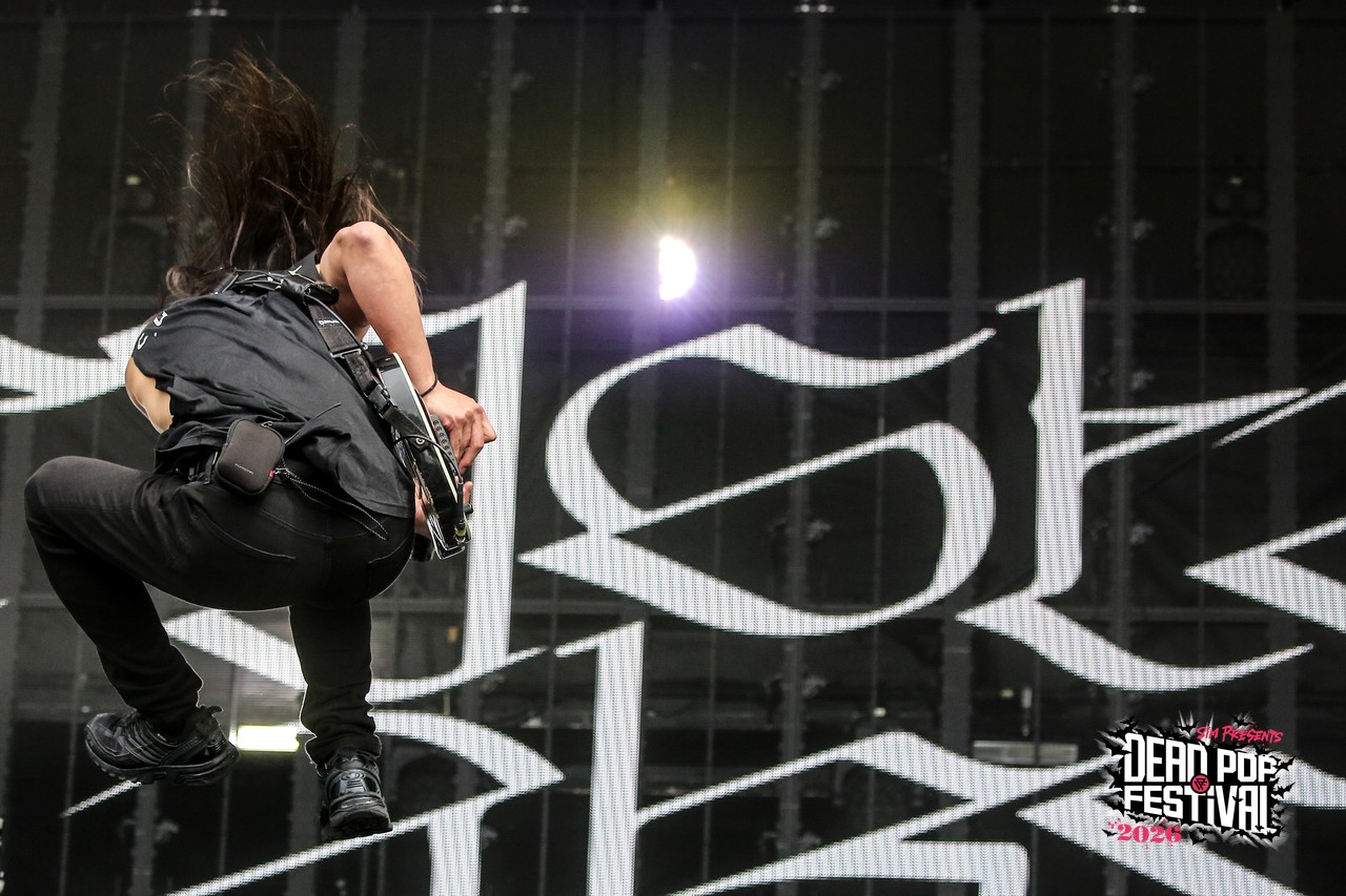 幕開けは「Everblack」。PKの「We are Crystal Lake!」のかけ声とともに、するどいギターリフと地を這う低域ビートが重なりうなりを上げる。黒一色の4人から放たれる音は風に乗り、景色ごと揺らす錯覚を生む。PKの咆哮を合図に、音の奔流がフロアへとなだれ込む。オーディエンスはハンズアップで反応し、音と熱がフロアに循環する。重厚なリフは体の奥深くまで突き刺さり、ビートに導かれるように動きがつながっていく。続く「BlüdGod」では、前方にハードコアピッドの渦が出現。ぶつかり合うだけではなく、音に呼応してエネルギーが行き交う空間が生まれている。ダークで幻想的な音とオーディエンスの呼応が、野外特有の開放感と重なり、より大きな一体感へと変わっていく。砂煙と汗、湿った空気が混ざり合い、この場だけのリアルな質感を形作っていた。
