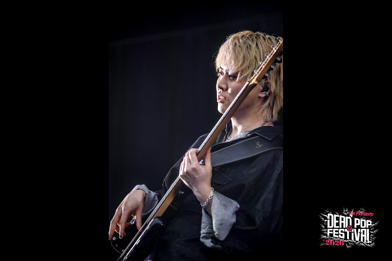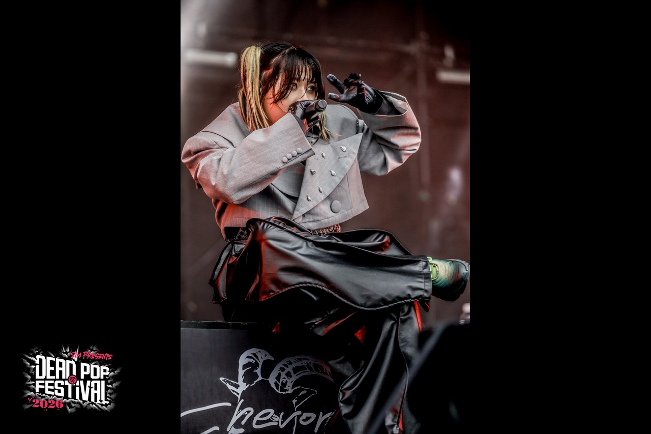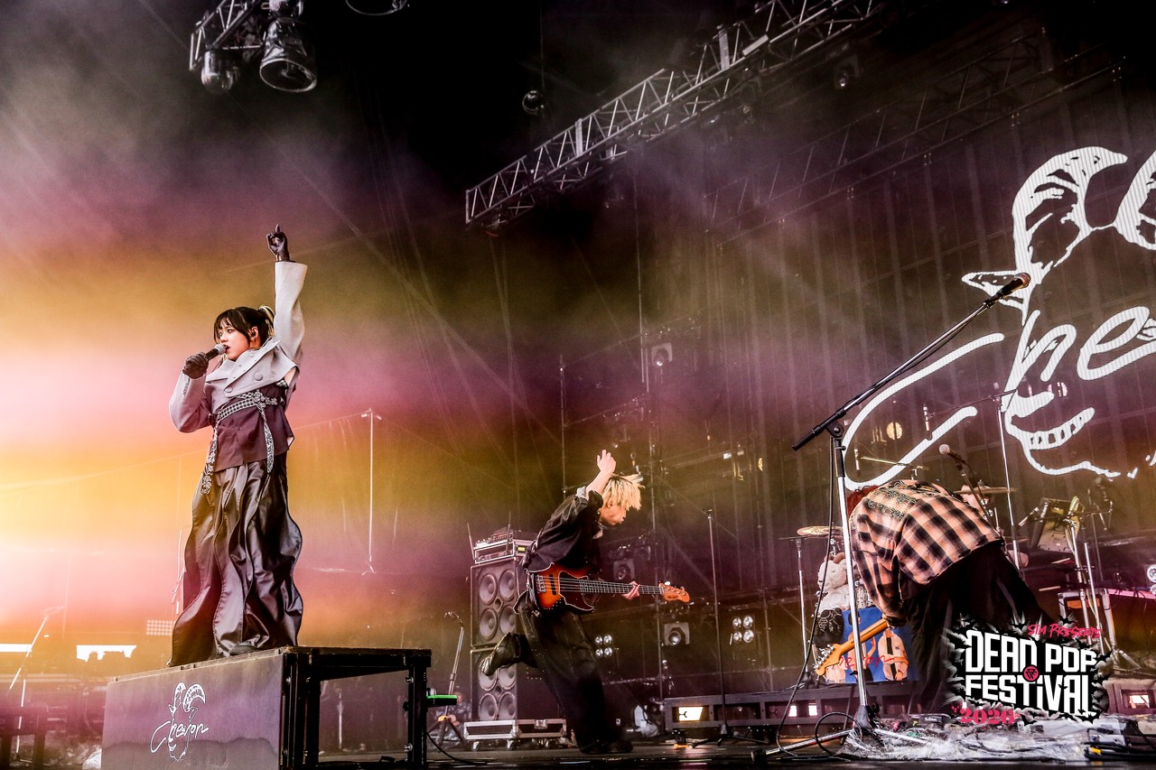 赤い照明をバックに儀式めいたSEが流れ、どこか不穏な空気がCAVE STAGEに流れ始める。まさにDEAD POP FESTiVALの幕開けに相応しい厳かな雰囲気だ。Ktjm(Gt)、オオノタツヤ(Ba)、谷絹茉優(Vo)が順番にステージへ登場するのに合わせて、フロアは大きなクラップハンズで歓迎を示す。1曲目はDEAD POPという魔界への挨拶がわりに「DUA・RHYTHM」。すでに曲終盤には前方でリフトとクラウドサーフが起こるなど、いつものChevonのライブ風景とは少し違うカオスな様相が生まれ始めていた。そうした混沌がいよいよ花咲いたのは次曲「冥冥」。曲の中盤でビートダウンするパートでは、“本来そういうリフではないであろうに”フロアはヘッドバンギングで答える。Ktjmとオオノタツヤのステージをいっぱいに使ったパフォーマンス、変幻自在に声を操りまくる谷絹の歌に合わせて、だんだんとオーディエンスはChevonに狂っていった。