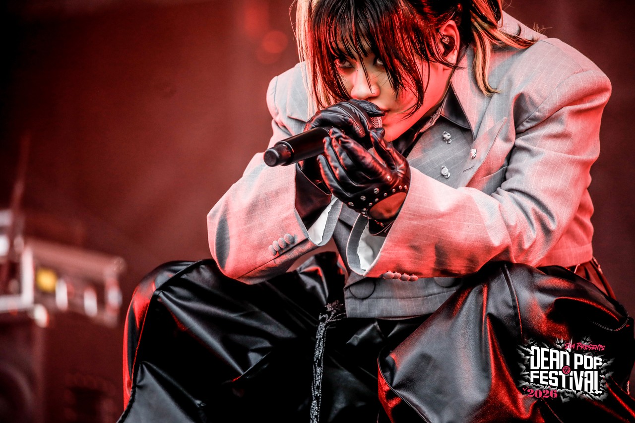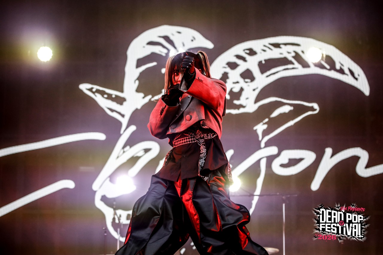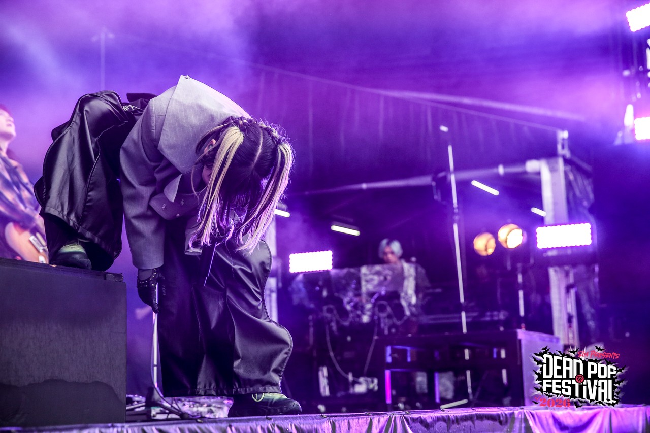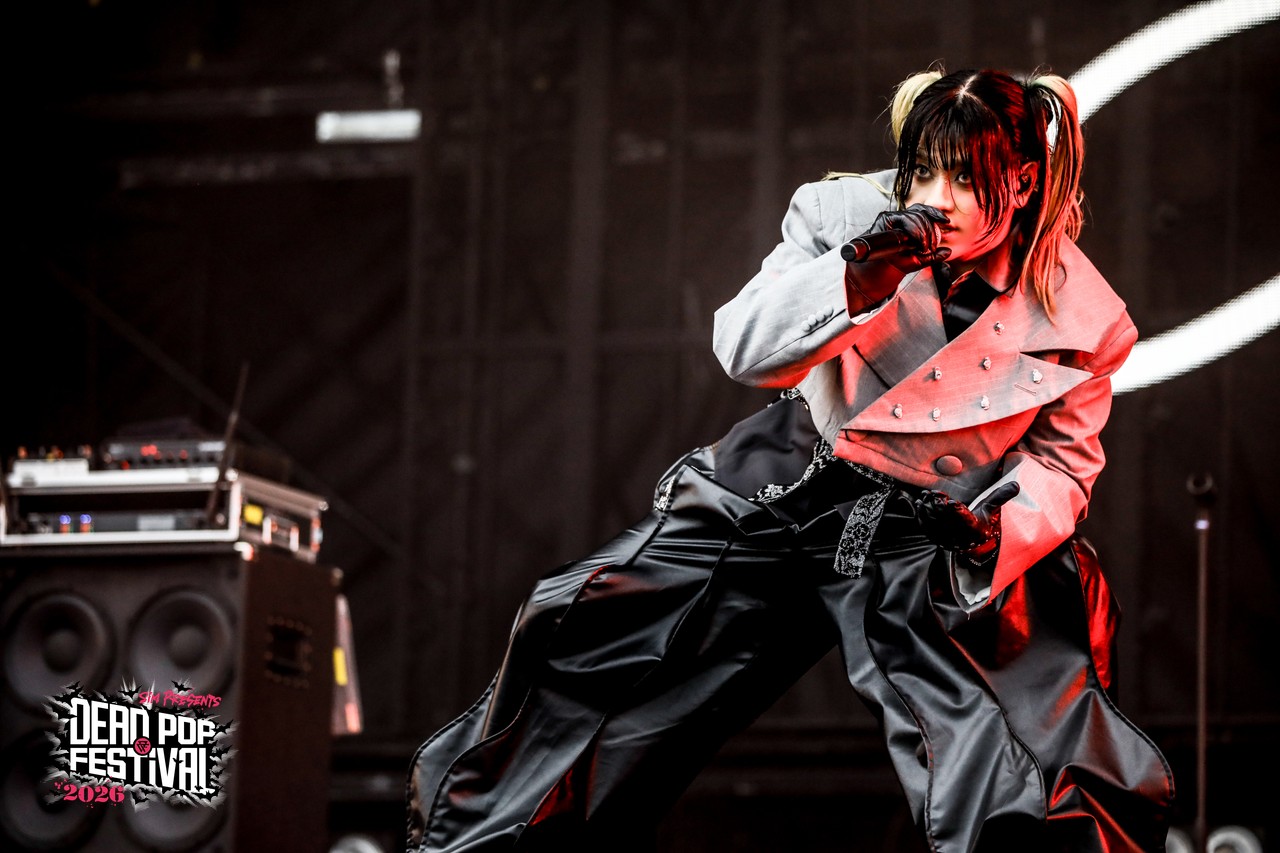 赤い照明をバックに儀式めいたSEが流れ、どこか不穏な空気がCAVE STAGEに流れ始める。まさにDEAD POP FESTiVALの幕開けに相応しい厳かな雰囲気だ。Ktjm(Gt)、オオノタツヤ(Ba)、谷絹茉優(Vo)が順番にステージへ登場するのに合わせて、フロアは大きなクラップハンズで歓迎を示す。1曲目はDEAD POPという魔界への挨拶がわりに「DUA・RHYTHM」。すでに曲終盤には前方でリフトとクラウドサーフが起こるなど、いつものChevonのライブ風景とは少し違うカオスな様相が生まれ始めていた。そうした混沌がいよいよ花咲いたのは次曲「冥冥」。曲の中盤でビートダウンするパートでは、“本来そういうリフではないであろうに”フロアはヘッドバンギングで答える。Ktjmとオオノタツヤのステージをいっぱいに使ったパフォーマンス、変幻自在に声を操りまくる谷絹の歌に合わせて、だんだんとオーディエンスはChevonに狂っていった。