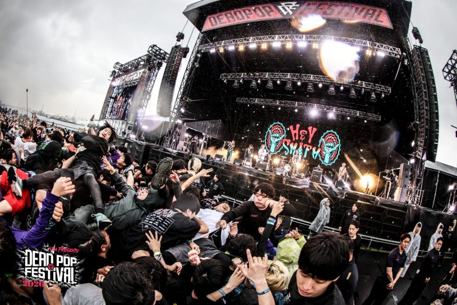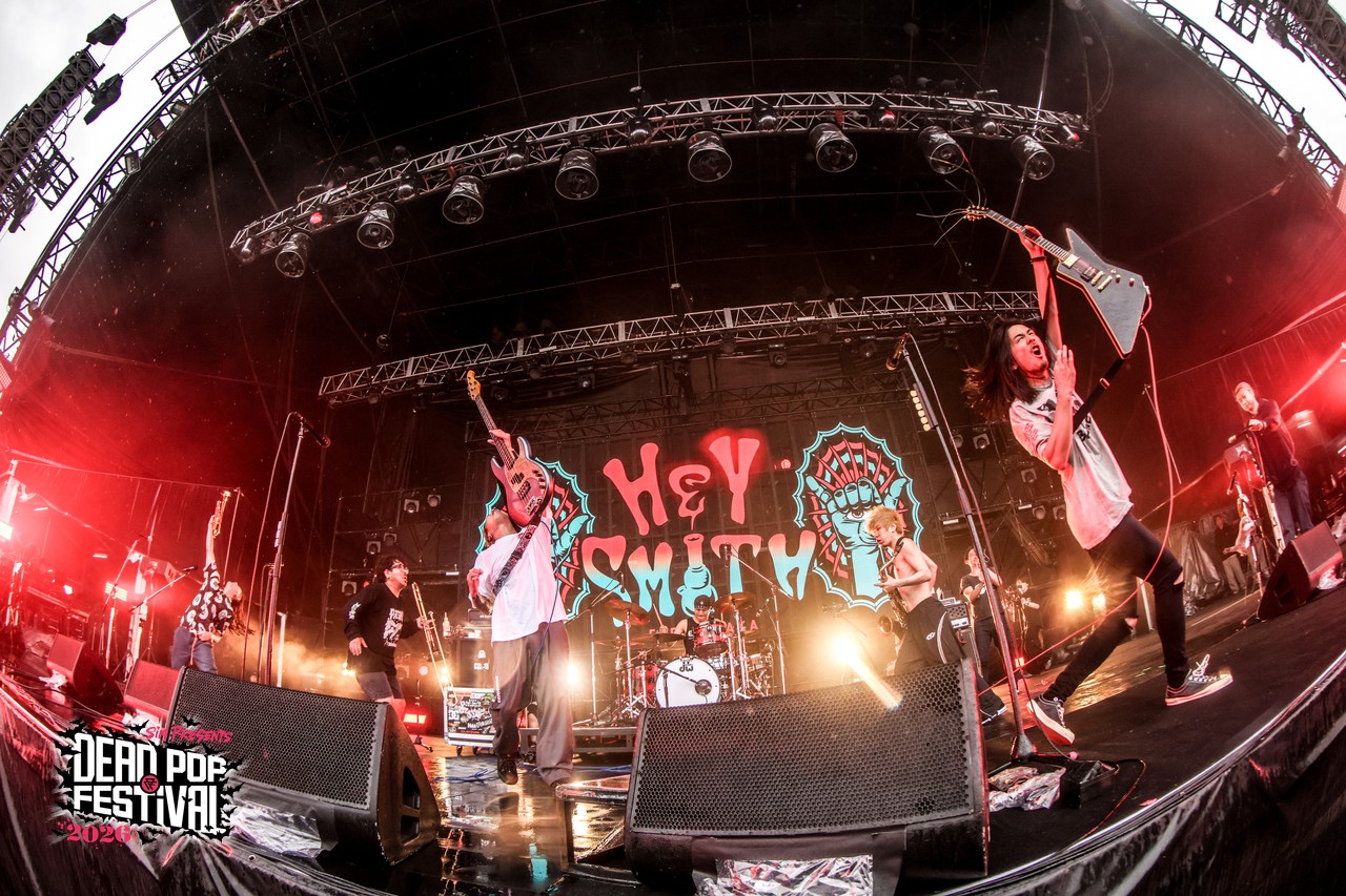 泥なんてなんだい、と少しばかり雨足は強くなったものの、だからどうしたと言わんばかりの熱狂を生み出したのがHEY-SMITHだ。悪天候なんて何のその、通常運転というか、いつも以上の踏み込み具合。曲の前にちょっとした言葉は挟むが、それ以外はMCらしいモノはなく、「行こうぜ、DEAD POP!」と猪狩秀平(Gt&Vo)が声を上げてスタートした「Living In My Skin」から最後までほぼノンストップ。ステージ上から発せられるエネルギーも半端ではない。