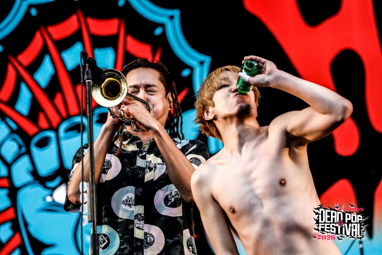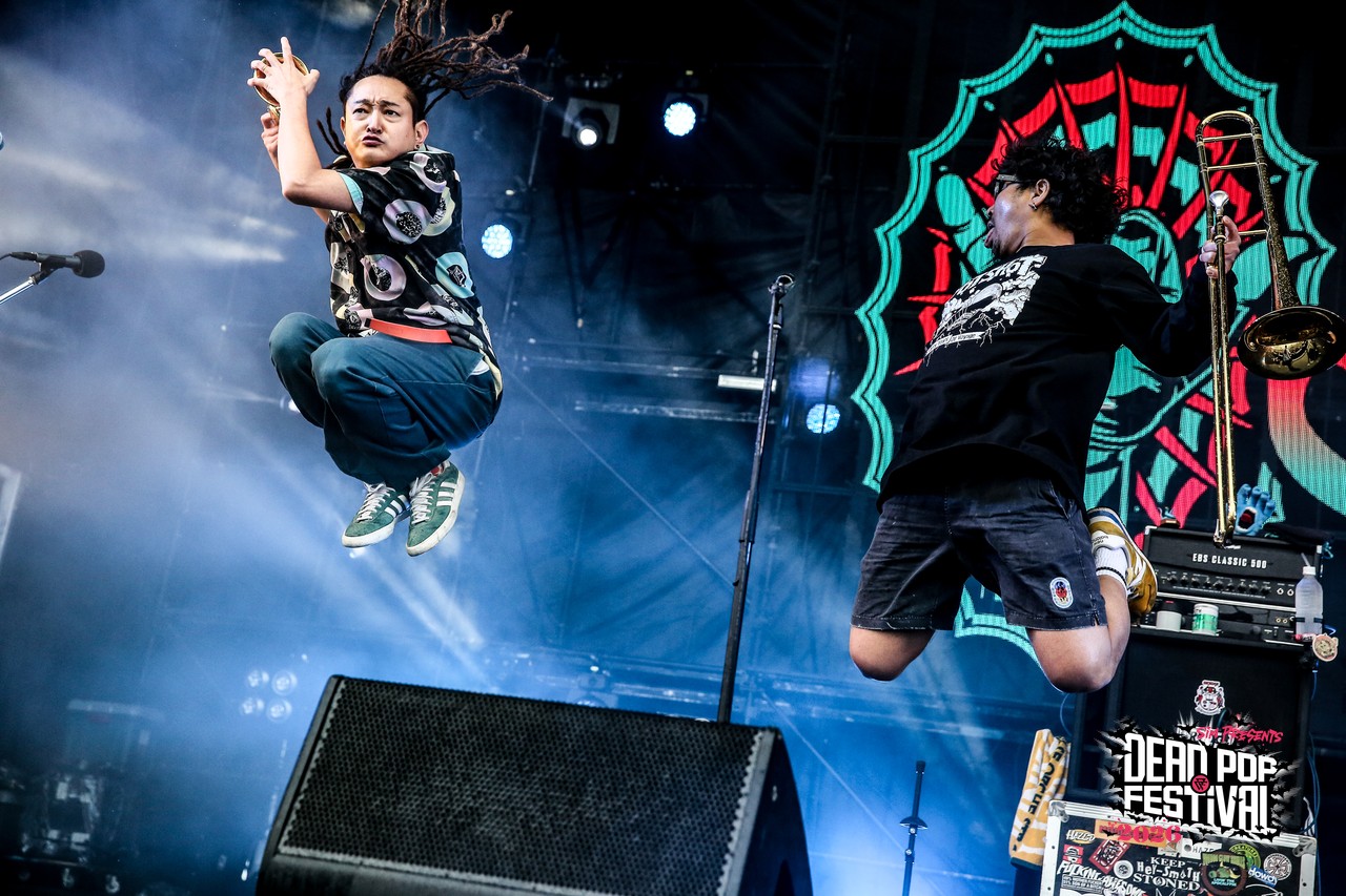 「覚悟を決めてきたんやろ! 歌え! 踊れ! 騒げ!」とオーディエンスの背中を押すパンチラインを猪狩が叫び、さらに勢いを増した「Into The Soul」、イイカワケン(Tp)、満(Sax)、Task-n(Dr)の見せ場を経て突入した「Drug Free Japan」、そこから間髪入れずに最高のタイム感でつなげた「Endless Sorrow」と中盤戦も揺るぎない流れ。客席はモッシュ、ダイブ、形にハマらないオリジナルな踊りが広がっていく最高な景色だ。