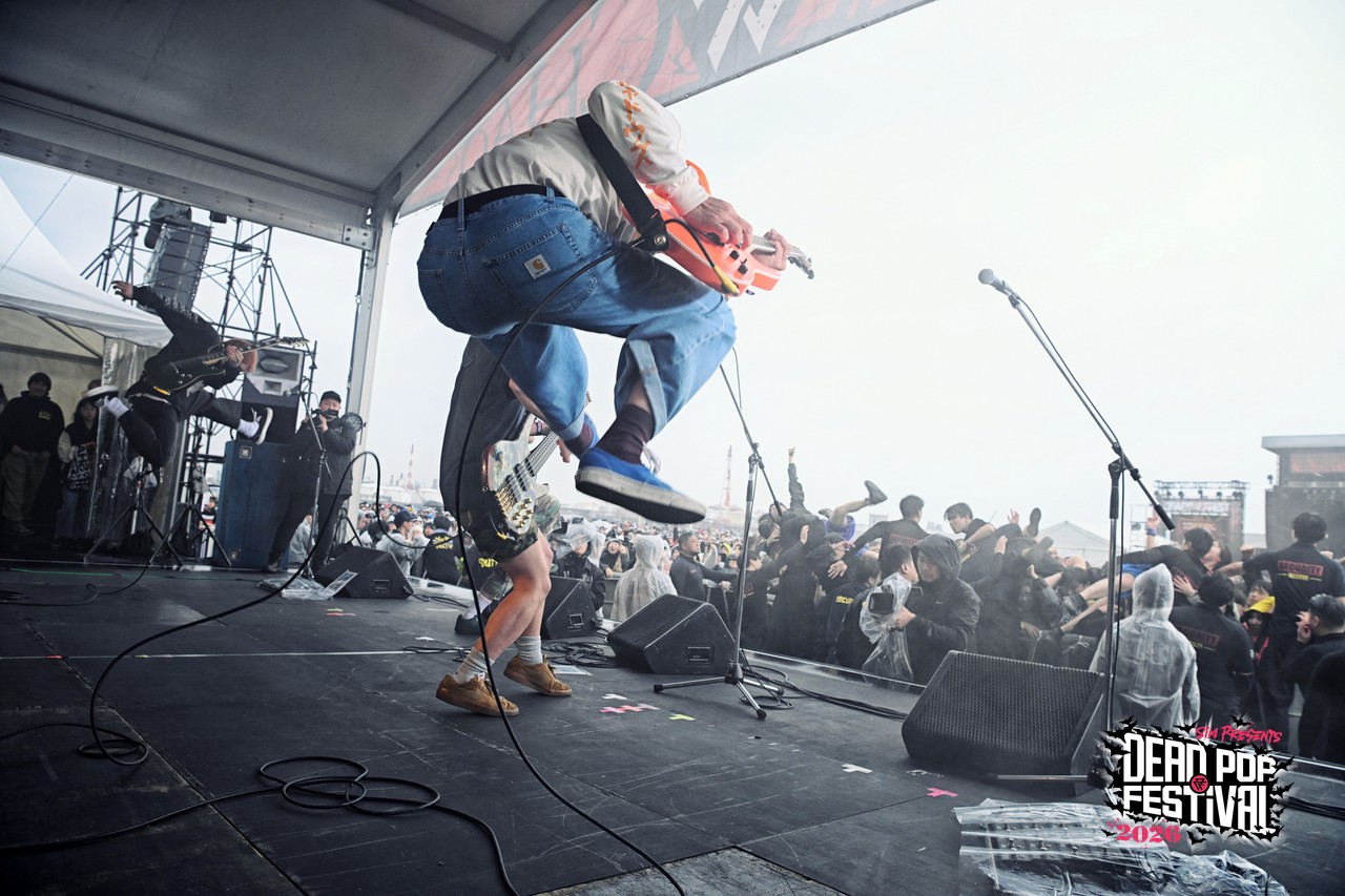 SHADOWSならではのパワフルな風が吹き抜け、先ほどまで激しかった雨もやや落ち着く。フロアではシンガロングとハンズアップが広がり、美しい光景が生まれる。続いて「動け、動け! MOVE!」とあおり、アッパーなナンバー「CLIMB」へ。静から動へと一気に切り替わる展開に、オーディエンスはダイブやハードコアピットで応え、ステージと激しく呼応していく。4曲目は疾走感あふれる「So What」。冒頭から息をつかせぬ連打で、圧倒的な存在感を刻みつけた。