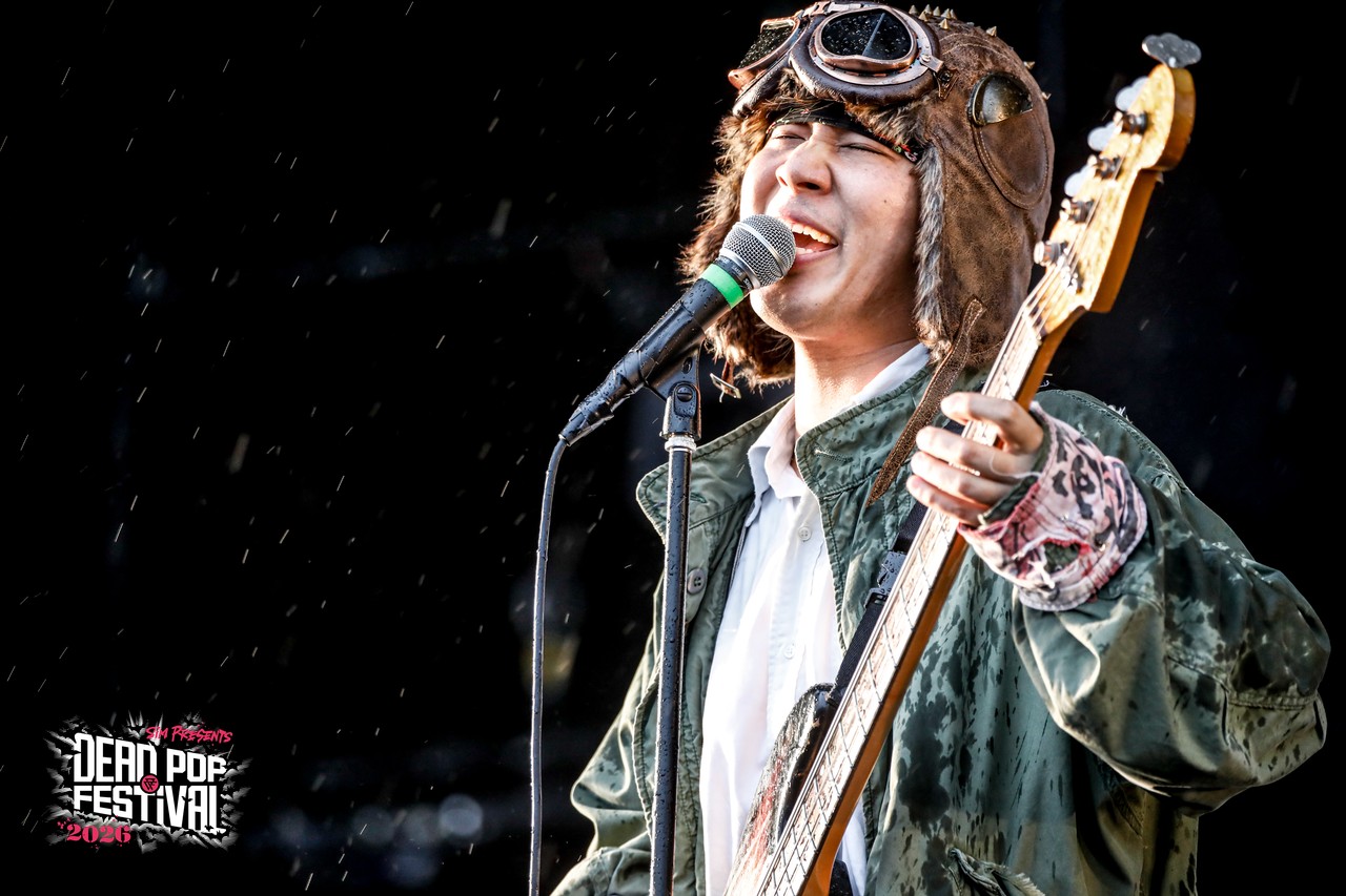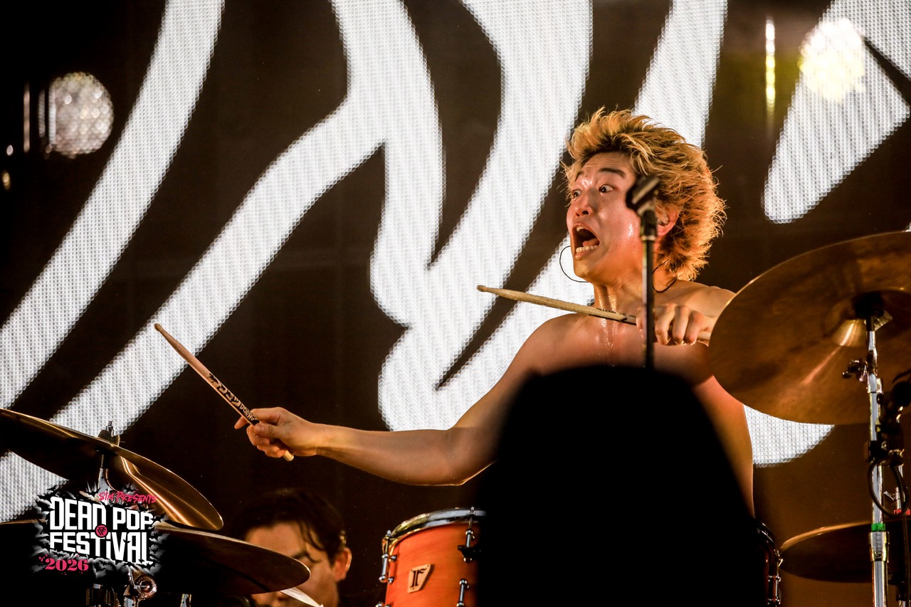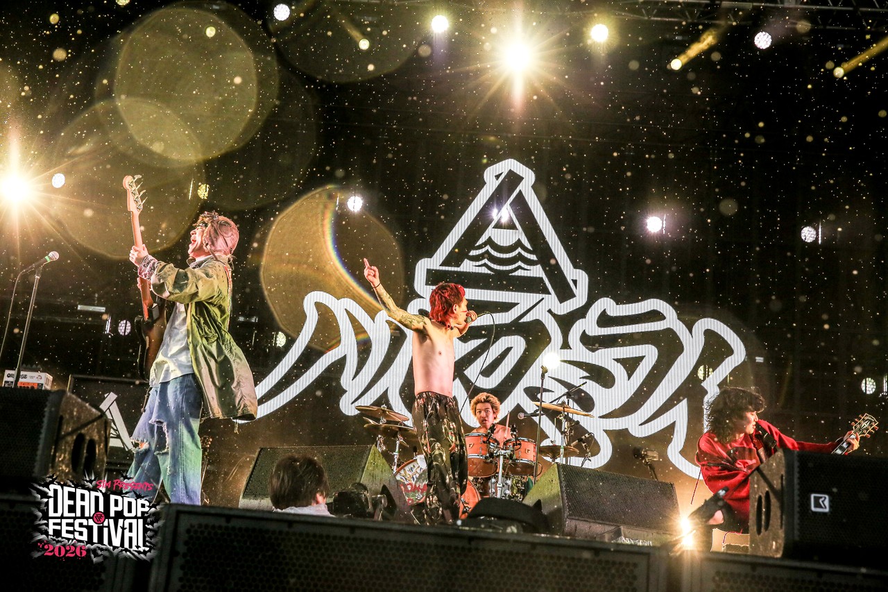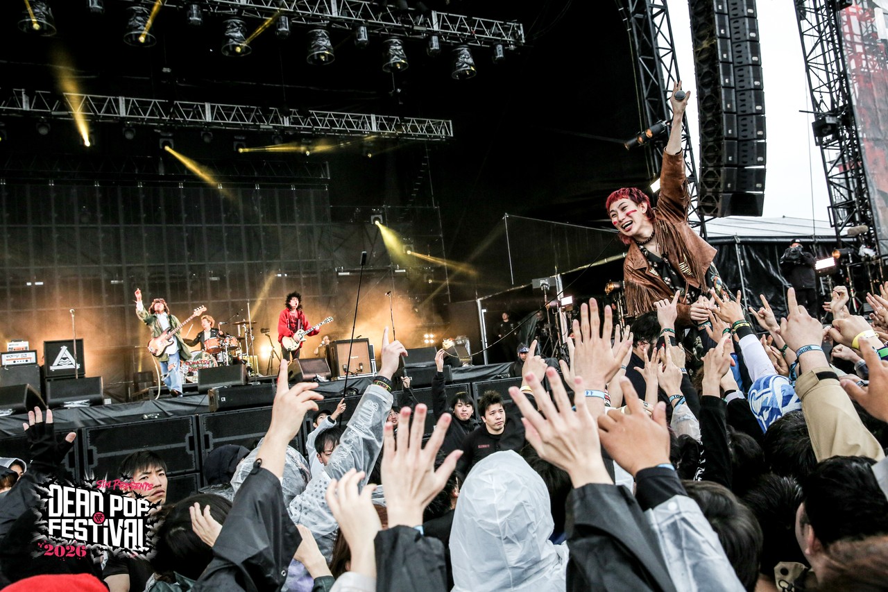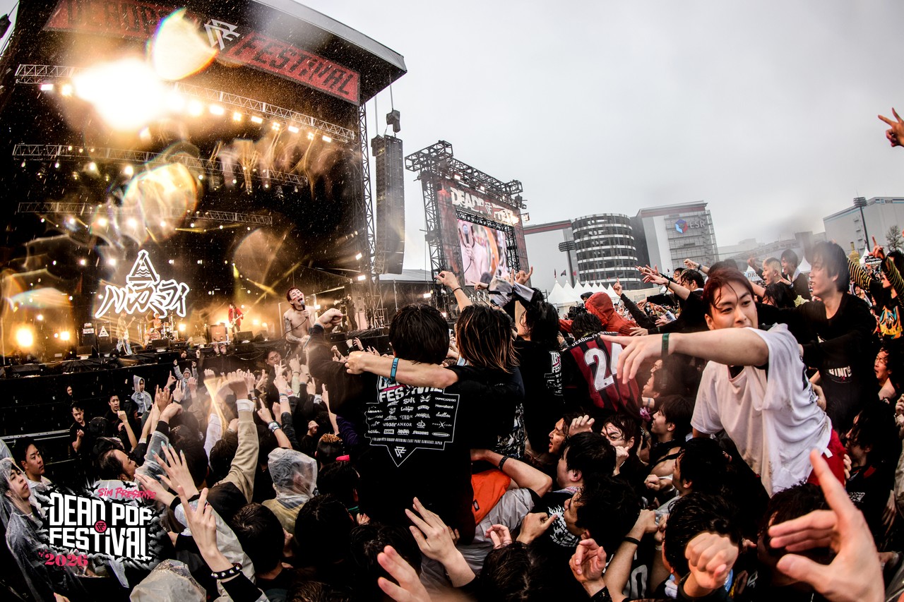 降ったり止んだりを繰り返す雨。4月らしくまだどこか肌寒い気候。ぬかるんだ地面。これが最後のほうなら「どうでもなれ!」と潔く開き直れるが、まだ始まったばかり。どうしてもどんよりした気持ちになってしまいそうになる。そんな時間帯に、ズカズカとDPFにやってきたのがハルカミライだ。登場のジングルを待ちきれず走ってステージにやってくる須藤俊(Ba)、関大地(Gt)、小松謙太(Dr)。登場するなりステージを経緯してそのままフロアへ進み、デッカい声で「サンキュー、DEAD POP FESTiVALー!よろしくお願いしまあす!」と自己紹介する橋本学(Vo)。鬱々とした気分を、元気いっぱいのハルカミライが一瞬で吹き飛ばしてくれるぞー!
