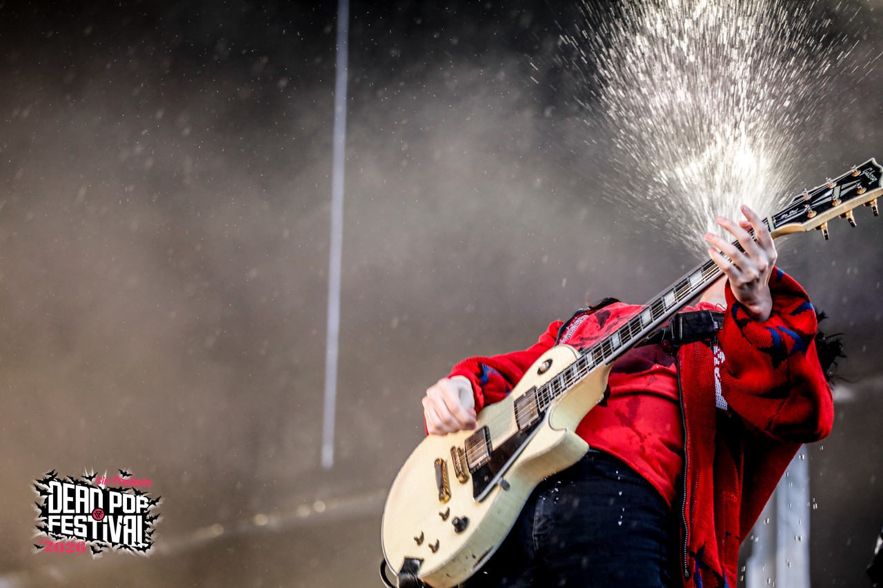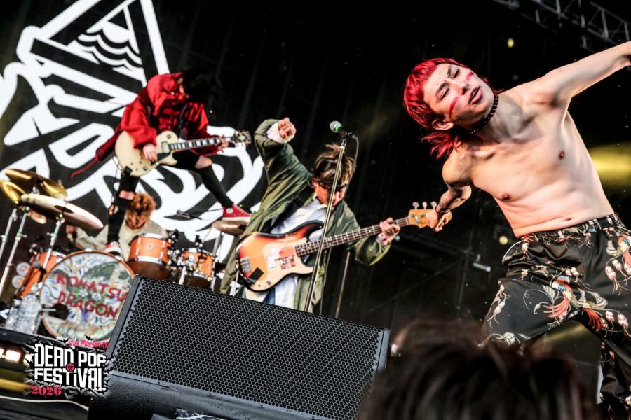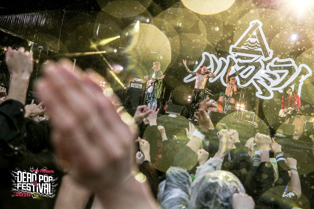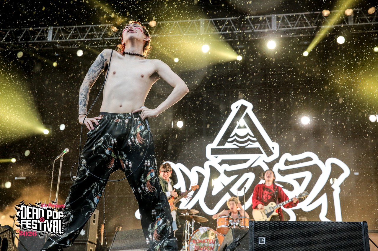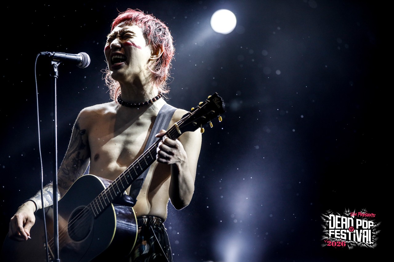 降ったり止んだりを繰り返す雨。4月らしくまだどこか肌寒い気候。ぬかるんだ地面。これが最後のほうなら「どうでもなれ!」と潔く開き直れるが、まだ始まったばかり。どうしてもどんよりした気持ちになってしまいそうになる。そんな時間帯に、ズカズカとDPFにやってきたのがハルカミライだ。登場のジングルを待ちきれず走ってステージにやってくる須藤俊(Ba)、関大地(Gt)、小松謙太(Dr)。登場するなりステージを経緯してそのままフロアへ進み、デッカい声で「サンキュー、DEAD POP FESTiVALー!よろしくお願いしまあす!」と自己紹介する橋本学(Vo)。鬱々とした気分を、元気いっぱいのハルカミライが一瞬で吹き飛ばしてくれるぞー!