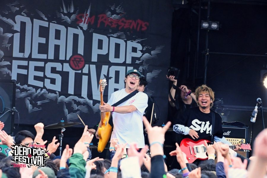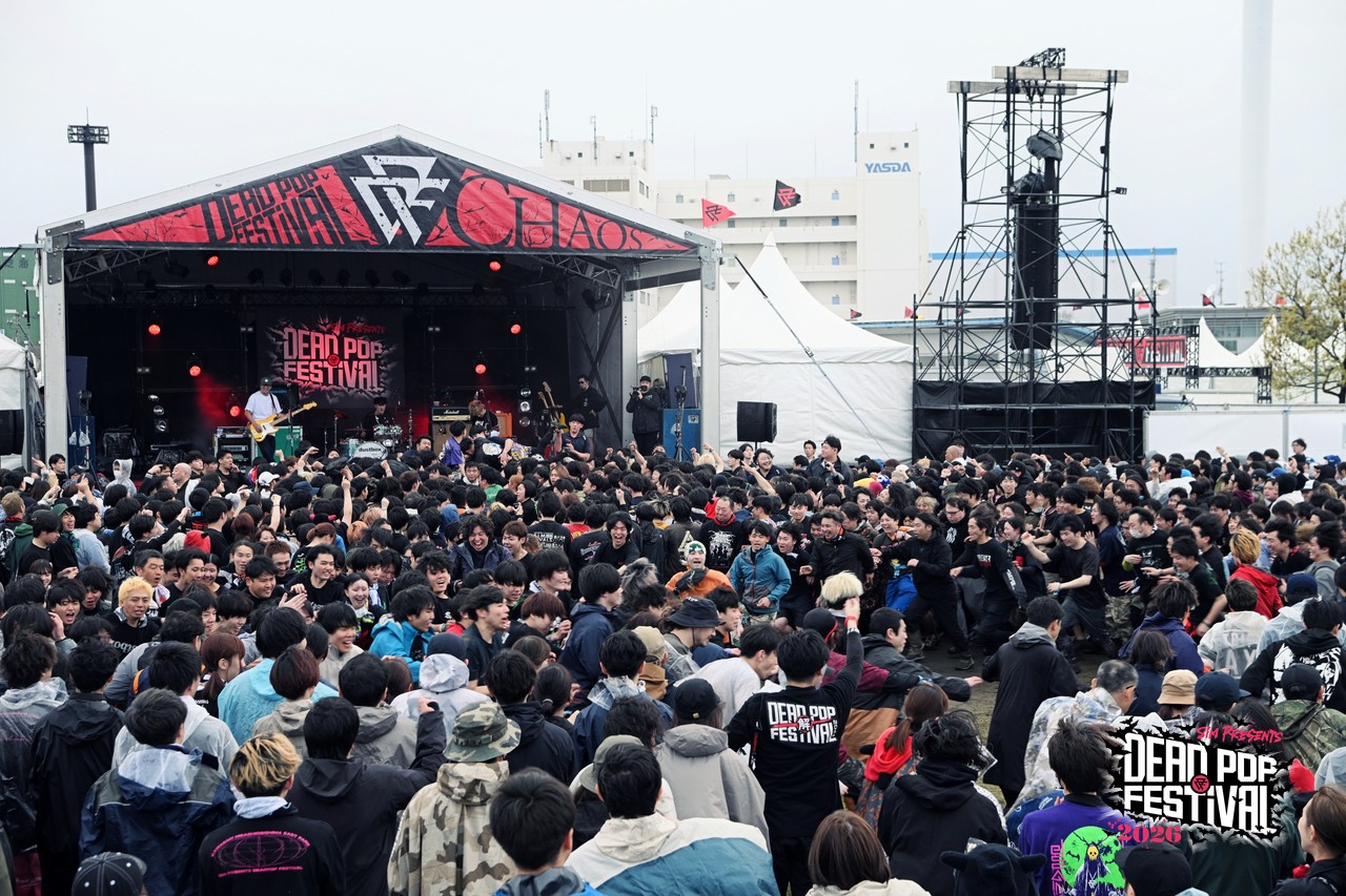 会場の東扇島では、スタートから降ったり止んだりの雨が、激しいライブの熱を程よく冷ましてくれる。だが、その雨も気がつけば、Fear, and Loathing in Las Vegasのライブの途中には上がっていた。オーディエンスの胸には、これから始まるライブへの期待がどんどん膨らみ、ステージ前のフロアには自然と楽しげな表情が広がっている。本番さながらのリハーサルを終え、SEとともにメンバーが登場。SUGA(Vo&Gt)はSiMのTシャツ姿だ。JOJI(Ba&Cho)が「晴れてきてんじゃねぇか!」と話した通り、空にはうっすらと太陽の光が差し込んでいる。「DEAD POPいくぜ。さあ来い!」というSUGAの声が空へ伸びると、歓声が一斉に跳ね返り、会場の空気は一気にざわめきと熱を帯びていく。2018年以来、6年ぶりの出演となったdustboxのライブがスタートする。