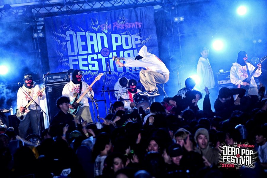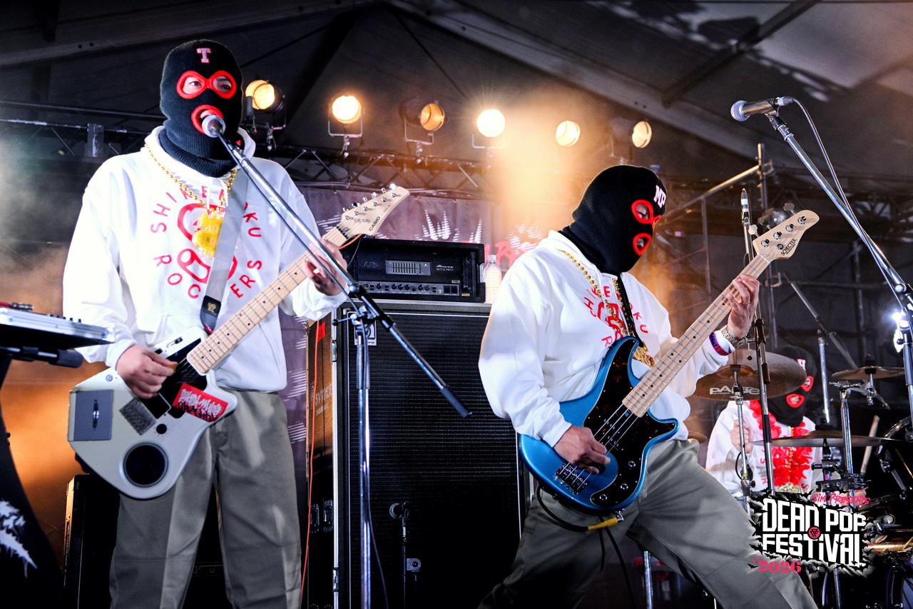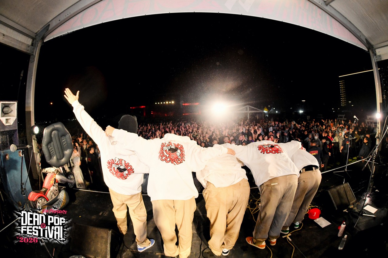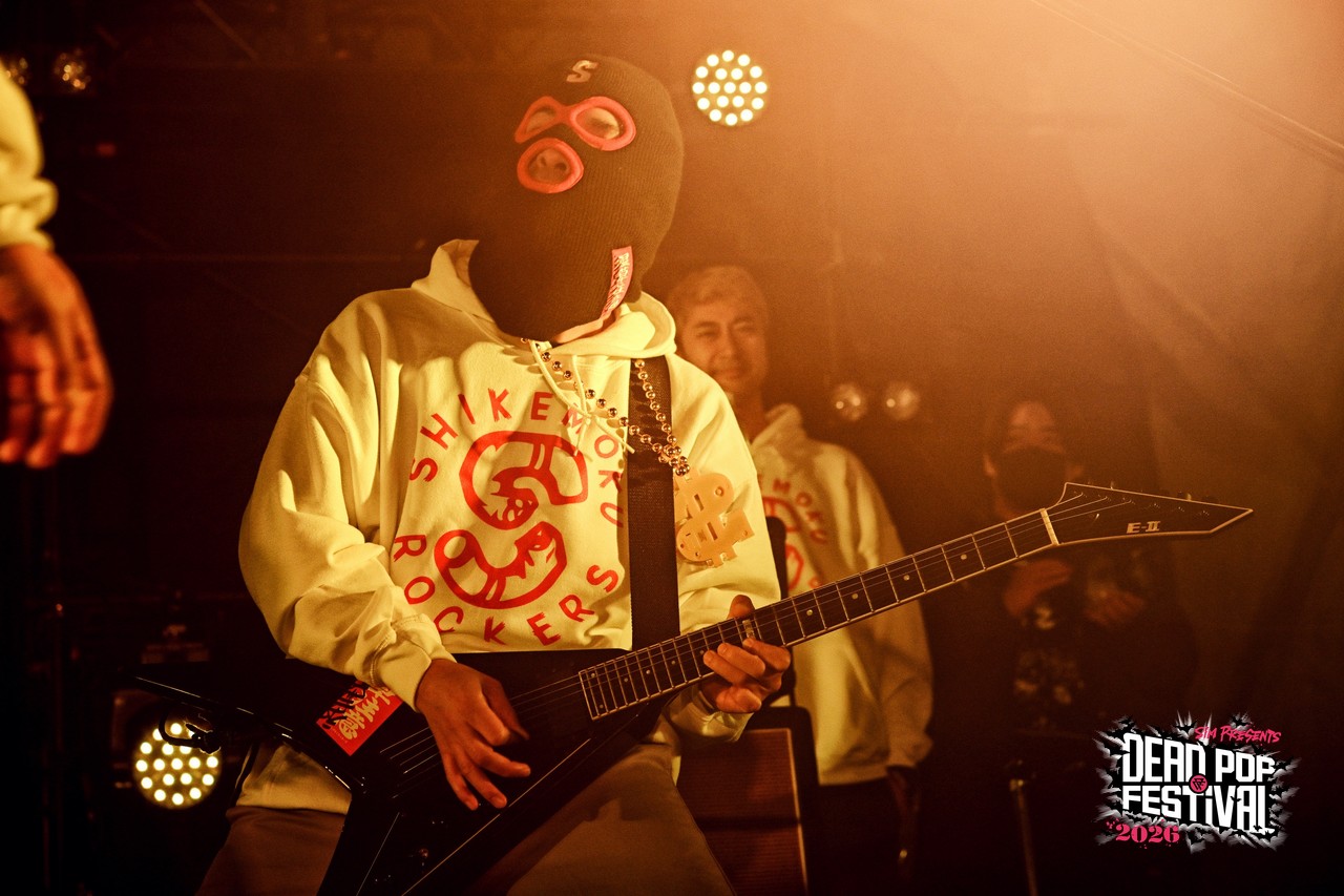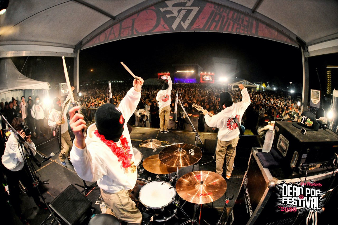 初日から数々の熱いライブが繰り広げられてきた東扇島。気がつけば空はすっかり黒に染まり、地獄の宴も残すところあと2バンド。疲れ知らずのオーディエンスは、これまでのライブを振り返りつつも、CHAOS STAGEのラストバンドへの興奮抑えきれない様子。ざわ……ざわ……ざわ……。というのも、リハーサル中のステージには、白パーカに黒の目出し帽という、どこか特撮の戦闘員を思わせる不穏な人達が姿を現していたからだ。そう、彼らこそがDEAD POP FESTiVAL初出演となるベテラン(あえてそう呼ばせてほしい!)、しけもくロッカーズの面々である。事前の出演アーティストコメントでも、「SiM以外に気になるアーティスト」として名前が挙がっていたこともあり、ステージ脇にはバンドマンの姿がずらり。その光景だけでも期待値は十分に高まる。言ってしまえば、これは絶対にヤバいやつという空気が充満している。とはいえ「誰が誰?」状態、さらにはバンド名すら初耳という人もいるはずなので補足しておこう。このバンドはもともと、dustboxのSUGAとJOJIを中心に、企画モノで結成された変名バンド。現在は、dustboxからJOJI ANGERとSUGA DEVIL、HAWAIIAN6からはHi-BISCUS HATANO、STOMPIN’BIRDからはTOMY CHINATOWN、そしてSHADOWSからMARA PIPPI SAKURAIという5人体制。名前を並べるだけでも豪華すぎる顔ぶれだ。しかも今回は約8年ぶりのライブということで、そのレア度も相当なもの。ざわ……ざわ……ざわ……。