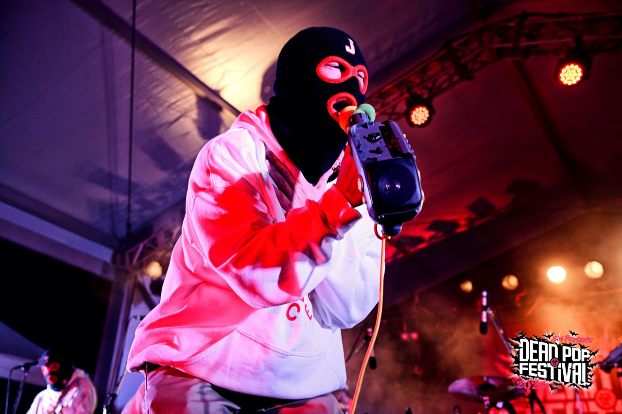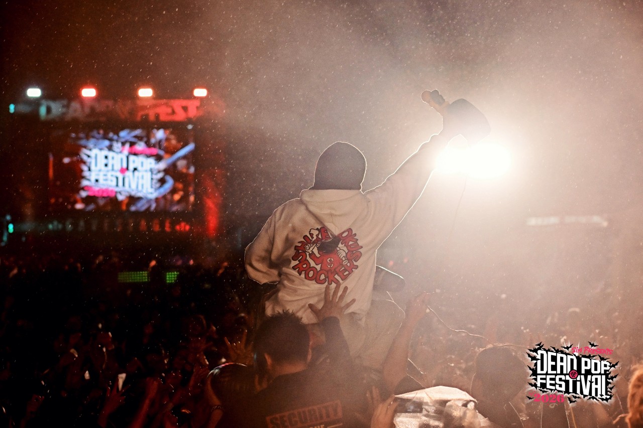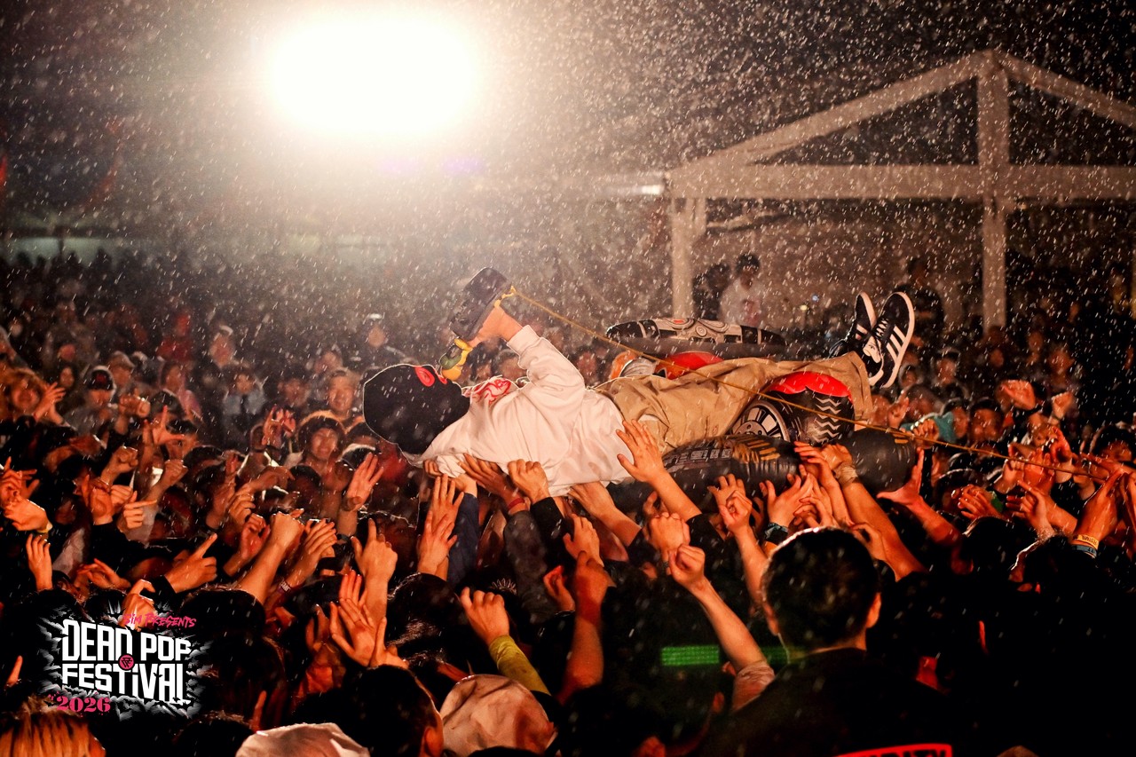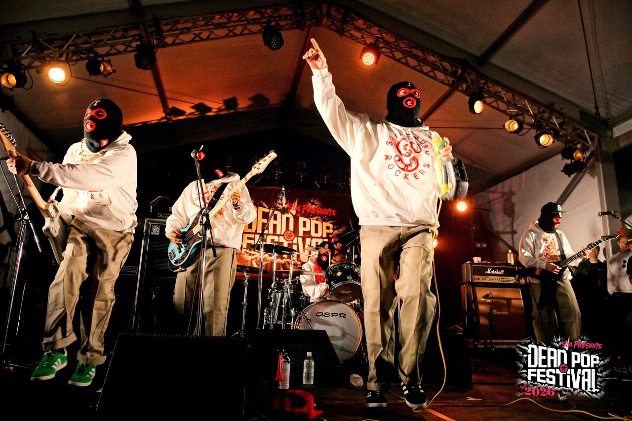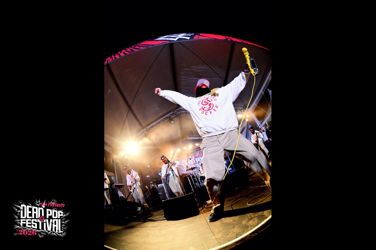 初日から数々の熱いライブが繰り広げられてきた東扇島。気がつけば空はすっかり黒に染まり、地獄の宴も残すところあと2バンド。疲れ知らずのオーディエンスは、これまでのライブを振り返りつつも、CHAOS STAGEのラストバンドへの興奮抑えきれない様子。ざわ……ざわ……ざわ……。というのも、リハーサル中のステージには、白パーカに黒の目出し帽という、どこか特撮の戦闘員を思わせる不穏な人達が姿を現していたからだ。そう、彼らこそがDEAD POP FESTiVAL初出演となるベテラン(あえてそう呼ばせてほしい!)、しけもくロッカーズの面々である。事前の出演アーティストコメントでも、「SiM以外に気になるアーティスト」として名前が挙がっていたこともあり、ステージ脇にはバンドマンの姿がずらり。その光景だけでも期待値は十分に高まる。言ってしまえば、これは絶対にヤバいやつという空気が充満している。とはいえ「誰が誰?」状態、さらにはバンド名すら初耳という人もいるはずなので補足しておこう。このバンドはもともと、dustboxのSUGAとJOJIを中心に、企画モノで結成された変名バンド。現在は、dustboxからJOJI ANGERとSUGA DEVIL、HAWAIIAN6からはHi-BISCUS HATANO、STOMPIN’BIRDからはTOMY CHINATOWN、そしてSHADOWSからMARA PIPPI SAKURAIという5人体制。名前を並べるだけでも豪華すぎる顔ぶれだ。しかも今回は約8年ぶりのライブということで、そのレア度も相当なもの。ざわ……ざわ……ざわ……。