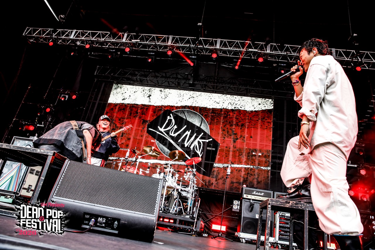 「Red Criminal」では山中が「やばいの見せてくれるんでしょう?」とフロアをぱっくり割ると、「納得できるフロアになったらやります」と、PDFのフロアを試す。するとフロアからは怒号のような大きな「オイ!オイ!」との声が上がり、思わず山中も笑い出してしまう。ステージがガンガン攻める気なら、フロアもガンガン攻めていく気だ。山中は「出るたびに熱量が上がっている気がしてめちゃめちゃうれしいです」と言っていたが、こうやって出るたび出るたびにTHE ORAL CIGARETTESが熱量を上げてくれているからこそなのではないだろうか。“納得できるフロア”が完成したところで、バンドが続きに入ると、フロアはさらに熱狂の渦となる。曲が終わっても途切れないダイバーに目を向けた山中が「ダイバーを早く“ERASE”してください」と言えば、すかさず鈴木のギターリフが鳴り響き「ERASE」へ。さらに、ヘドバンの波が揺れた「カンタンナコト」、ダビーな展開を挟んで音に潜らせる「DIKIDANDAN」と音を一切止めずにつないでいく。完全にDPFを信頼し切っている証拠だ。多くの人がイントロで「Masatoが来る!」とわかったのは、もちろん「DUNK feat.Masato(coldrain)」。袖からMasatoが飛び出し、Masatoのシャウトと共にさらに遊んで行った。
